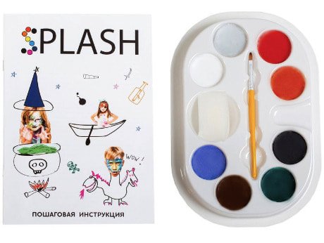 В комплекте краски, инструкция по применению; кисть; спонж. В наборе 8 цветов: красный, серебряный, серо-сиреневый, зелёный, оранжевый, коричневый, черный,белый.