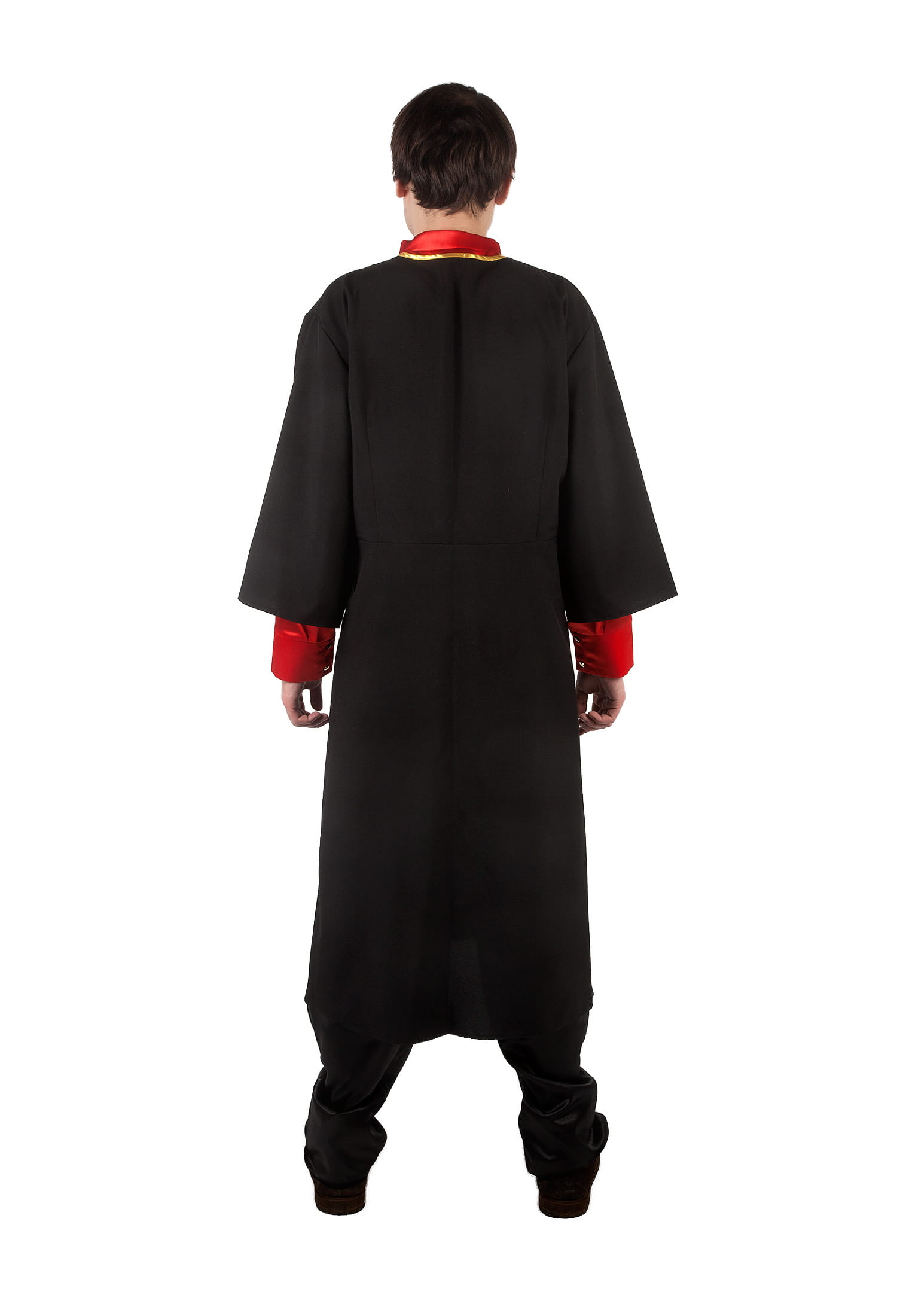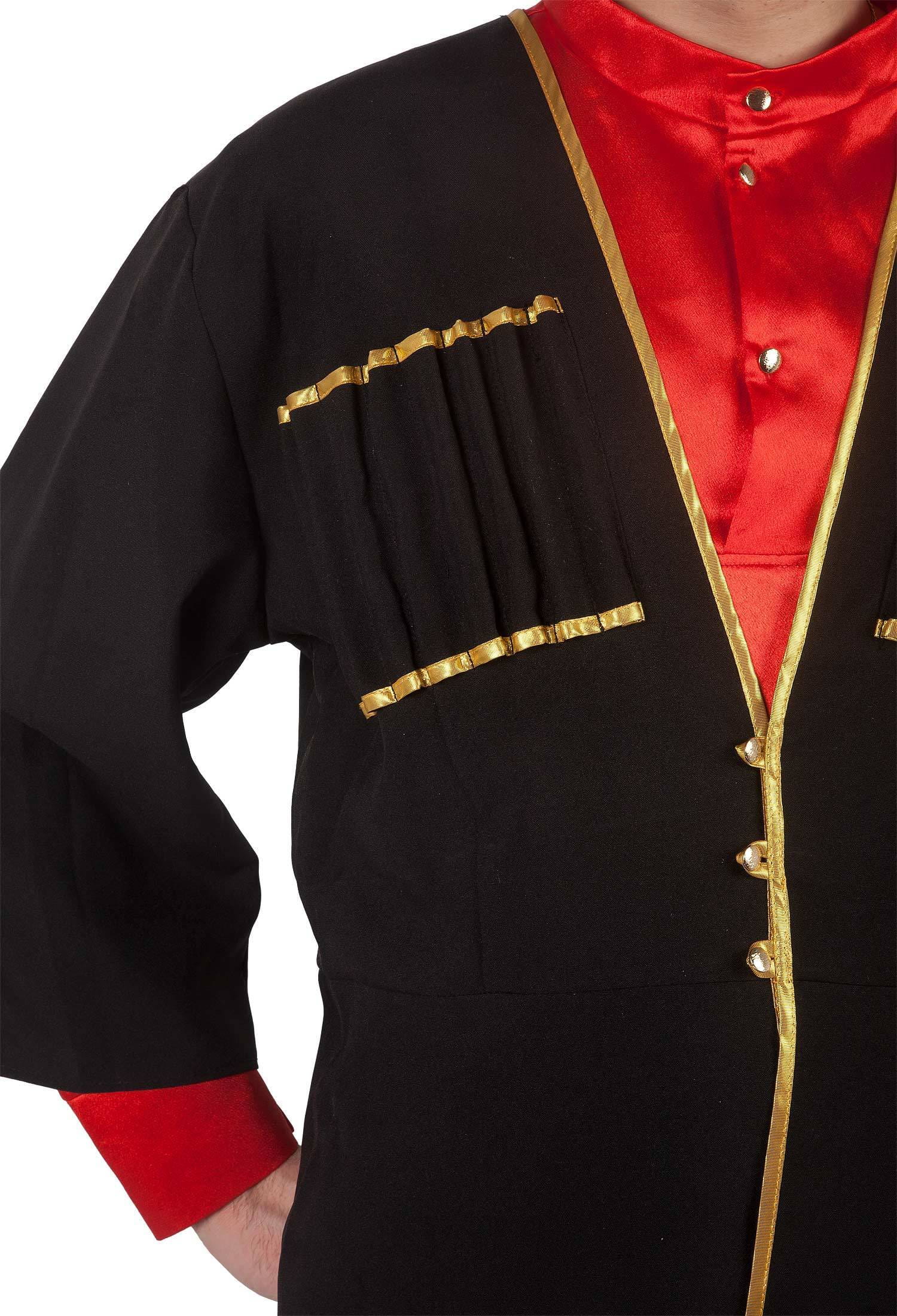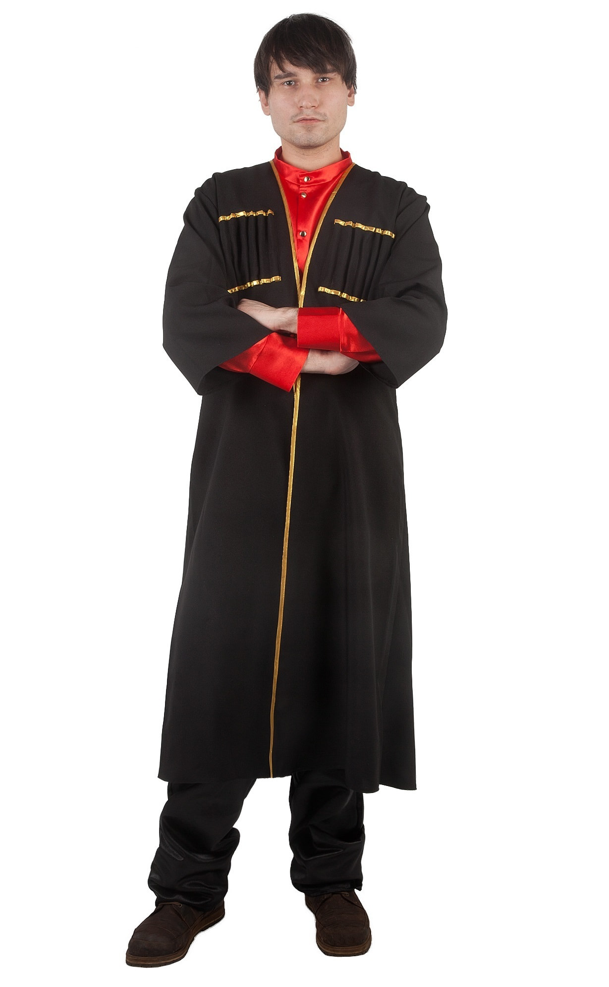 Мужской кавказский костюм состоит рубашки, брюк, кафтана черкески и чёрного тканевого пояса. Широкие брюки с резинкой на талии. На красной рубашке - золотистые пуговицы до середины изделия. Манжеты застёгиваются на пуговицы. Длинная чёрная черкеска с широкими рукавами декорирована золотой каймой. На груди – традиционные для кавказского костюма газыри, специальные кармашки для пороха и пулей. Эффектный костюм в классической цветовой гамме станет отличным выбором для сценических выступлений и других мероприятий.