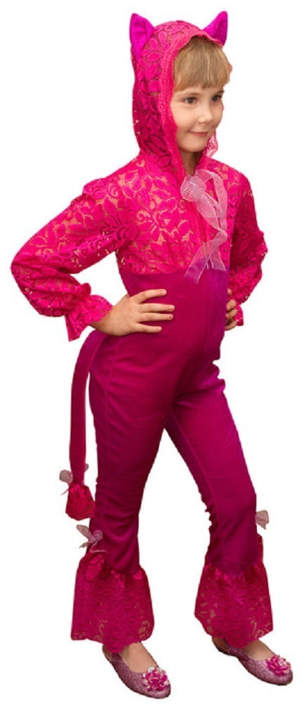 В комплекте комбинезон розового цвета с капюшоном и прикрепленным сзади хвостом. Комбинезон застегивается спереди на потайную молнию и имеет завязки на капюшоне с ушками. Верхняя часть костюма и оборки на штанинах выполнены из гипюровой ткани. Наряд украшен кружевной тесьмой на капюшоне и бантиками на брючинах и хвосте.