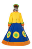 Кофта с широкими рукавами, манжеты собраны на резинку, сзади молния. Декор зелёными оборками и золотой тесьмой. Юбка широкая, в пол, украшена аппликацией в форме кругов, которые символизируют солнце. Подъюбник на кольцах придаёт юбке форму. Головной убор выполнен в народном стиле, завязывается на ленту.