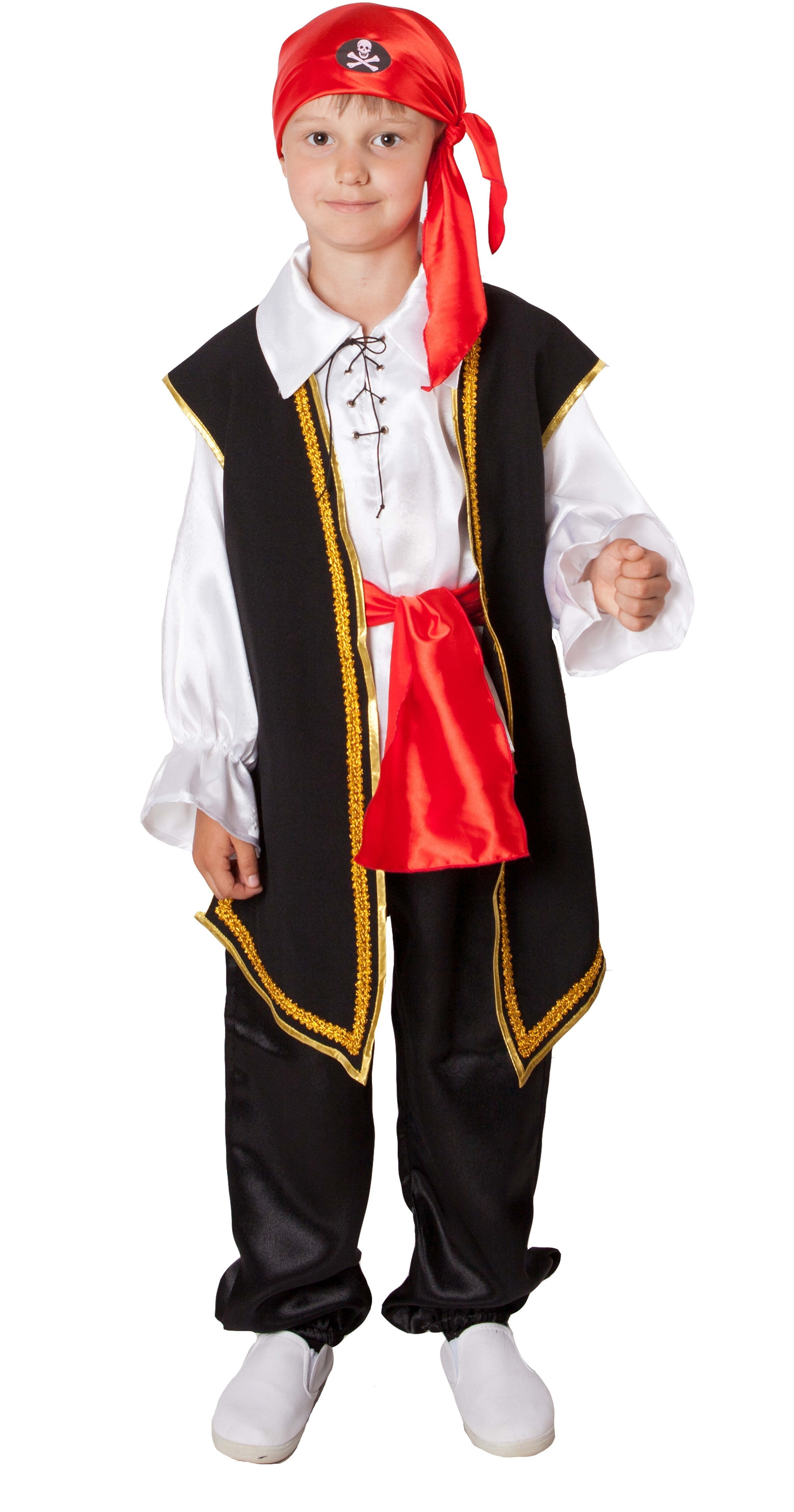 Пиратская тема – классика карнавалов. Вашему маленькому пирату будут рады на утреннике, костюмированном дне рождении или маскарадном шествии. Костюм отважного пирата – замечательный вариант образа морского разбойника. Белоснежная рубаха, длинный жилет, брюки и аксессуары – и ваш пиратик готов идти на абордаж!