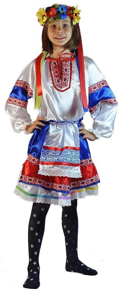 Костюм включает в себя расшитую блузку белого цвета, юбку, венок. Блузка и юбка выполнены в традиционном стиле, украшены тесьмой с орнаментом. Юбка с прикрепленным фартуком и резинкой на поясе оторочена белым кружевом. Образ дополняет венок с крупными яркими цветами и длинными атласными лентами.