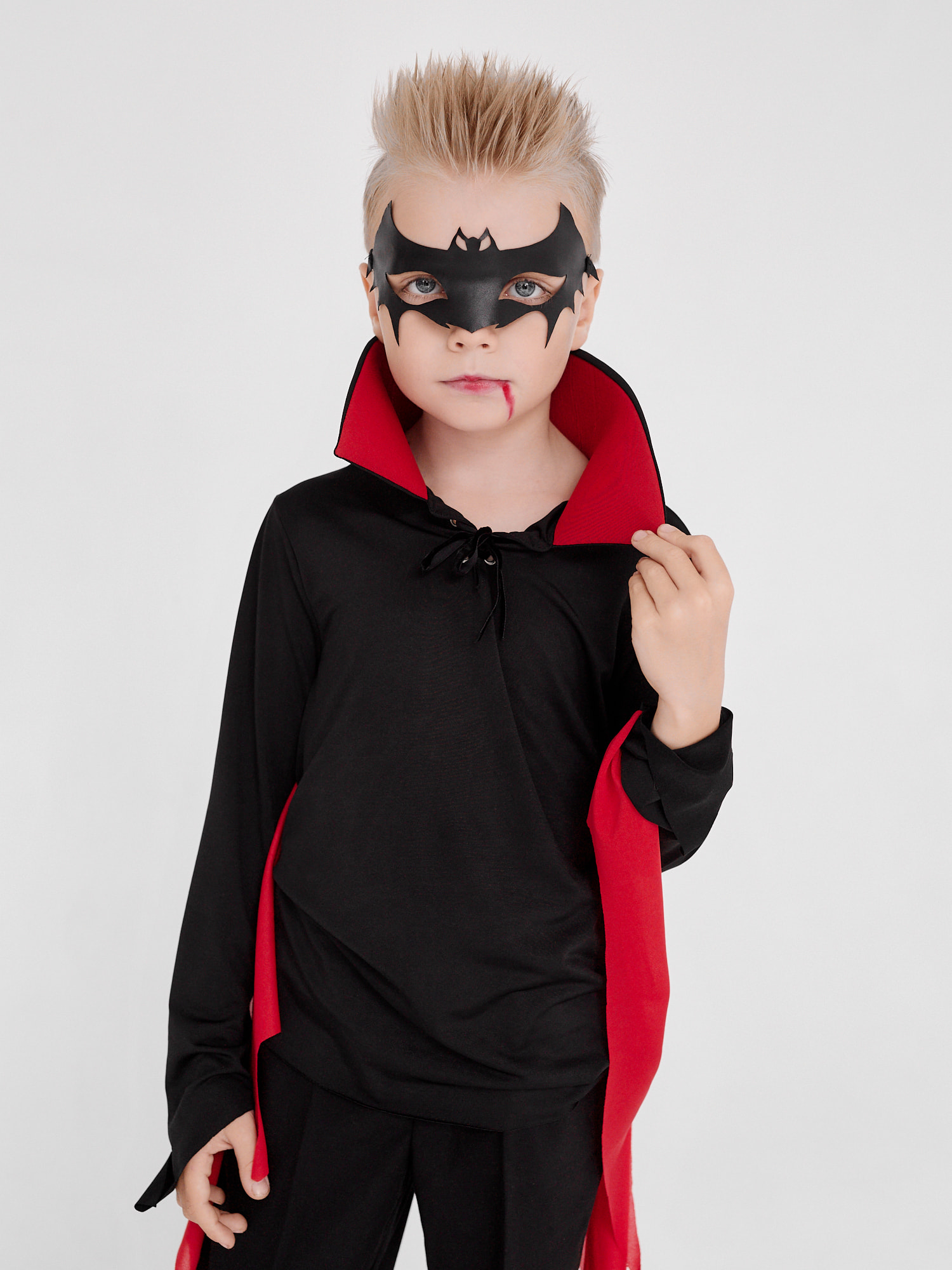 Детский костюм вампира для мальчика на Хэллоуин. В комплект входит рубашка с воротником-стойкой и рукавами-крыльями, а также маска на резинке. Рубашка из плотного трикотажа чёрного цвета, крылья из тонкой ткани красного цвета. Брюки не входят в комплект. Выбирайте детский карнавальный костюм вампира для мальчика!| Код товара | m2013 |