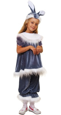 Маленькая, нежная, забавная – так можно охарактеризовать маленькую зайку. Классический наряд для похода вашей девочки на утренник или для спектакля – костюм зайчихи, состоящий из туники и штанишек. Стильное дополнение к костюму зайчихи – шапочка с забавными ушками, которые делают образ зверька еще милее. Приятный серый цвет и пушистая белая оторочка –особенности этого симпатичного наряда. Ваша маленькая зайка будет в восторге от такого костюма и очарует всех участников праздника.