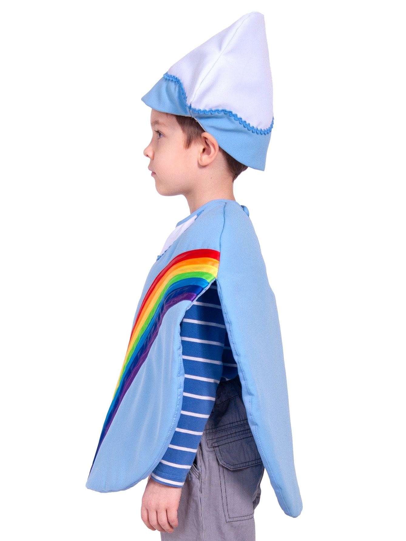 В комплект входит: маска-шапочка и накидка. На передней части костюма изображена яркая семицветная радуга и белое облако на голубом фоне, символизирующем небо.