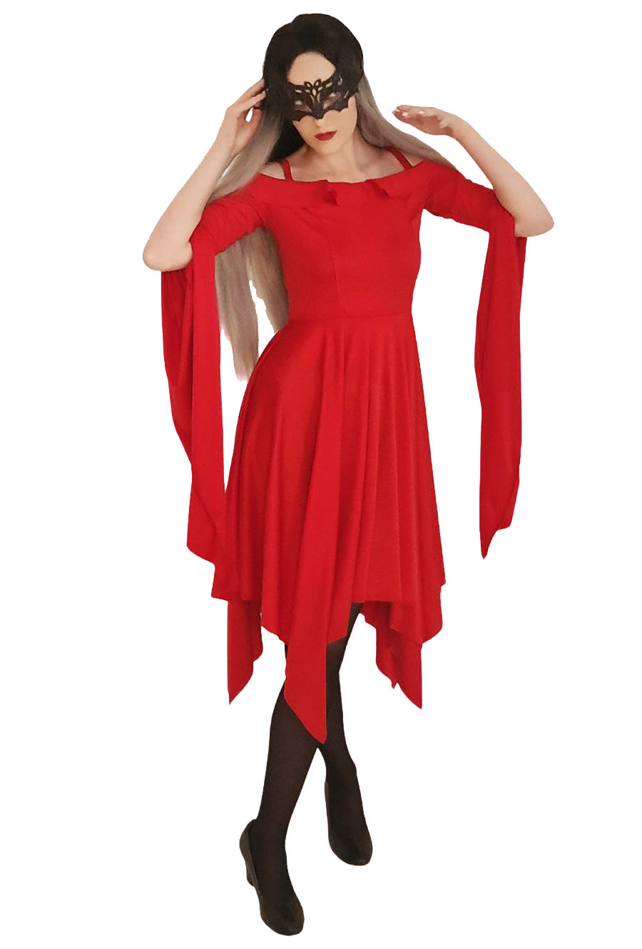 Красное платье послужит основой для карнавального костюма на Хэллоуин. Оно предназначено специально для того, чтобы вы могли воплотить в жизнь увлекательные образы на Хэллоуин: костюм дьяволицы (стоит добавить только рожки), костюм вампирши (в таком случае не забудьте про клыки) и костюм ведьмы (вам пригодится колпак и метла). Этот женский костюм на Хэллоуин - идеальный выбор для создания эффектного образа. Приталенный дизайн и интересный крой этого костюма подчеркивают фигуру, создавая элегантный и смелый облик. Широкие рукава добавляют драматичности и загадочности образу, что идеально сочетается с мистической атмосферой Хэллоуина. Материал: полиэстер. Этот костюм ведьмы, вампирши или дьяволицы станет отличным выбором для тех, кто желает выделиться и создать неотразимый образ на корпоративе, вечеринке.| Код товара | m3080r |