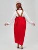 Русский народный сарафан женский взрослый выполнен в красном цвете. В комплект входит сарафан и блузка. Материал сарафана – габардин красного цвета, отделка тканью с принтом в стиле русских народных узоров: широкая полоса спереди, по груди и лямки сарафана. Блузка сшита из белого трикотажа, отделка красного цвета. Рукава длинные, манжеты на резинках. Ворот спереди на тесёмках. Выбирайте русский народный сарафан взрослый женский красного цвета на Масленицу, народные праздники, выступления и утренники!| Код товара | m3053К |