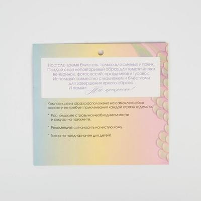 Стразы для лица Звезда танцпола. Композиция на самоклеящейся основе, клеится целиком, поэтому не нужно наносить каждый элемент по отдельности. Размер упаковки 16 14,5 см. Для наклеивания расположите стразы, отклеенные от основы, на чистую сухую кожу и прижмите. Время блистать!| Код товара | s4627860 |